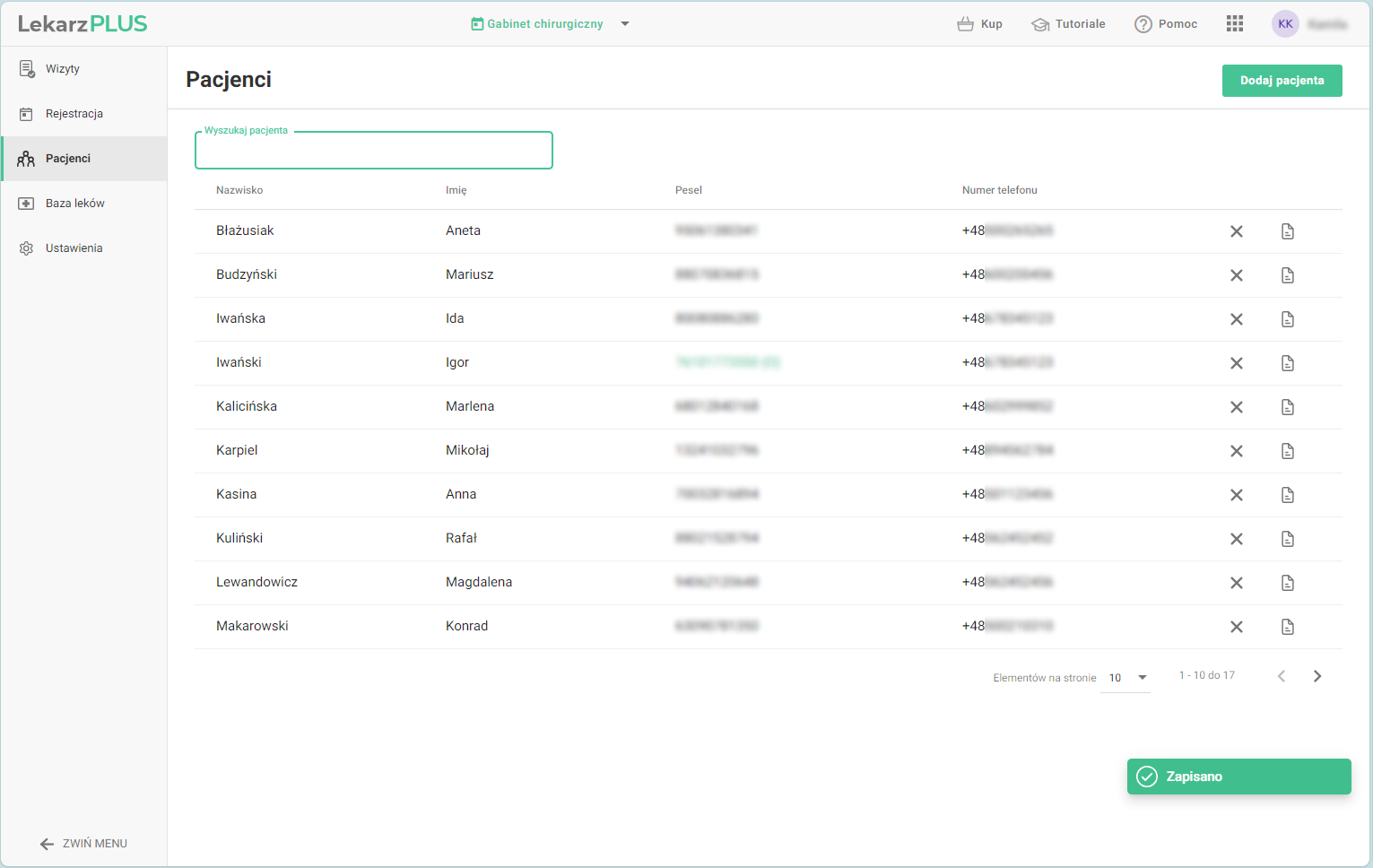 Wszystkie dane pacjentów są bezpiecznie przechowywane i łatwo dostępne w systemie. W razie potrzeby kartotekę można sprawnie wyeksportować, co zapewnia szybki wgląd w historię leczenia oraz ciągłość opieki.