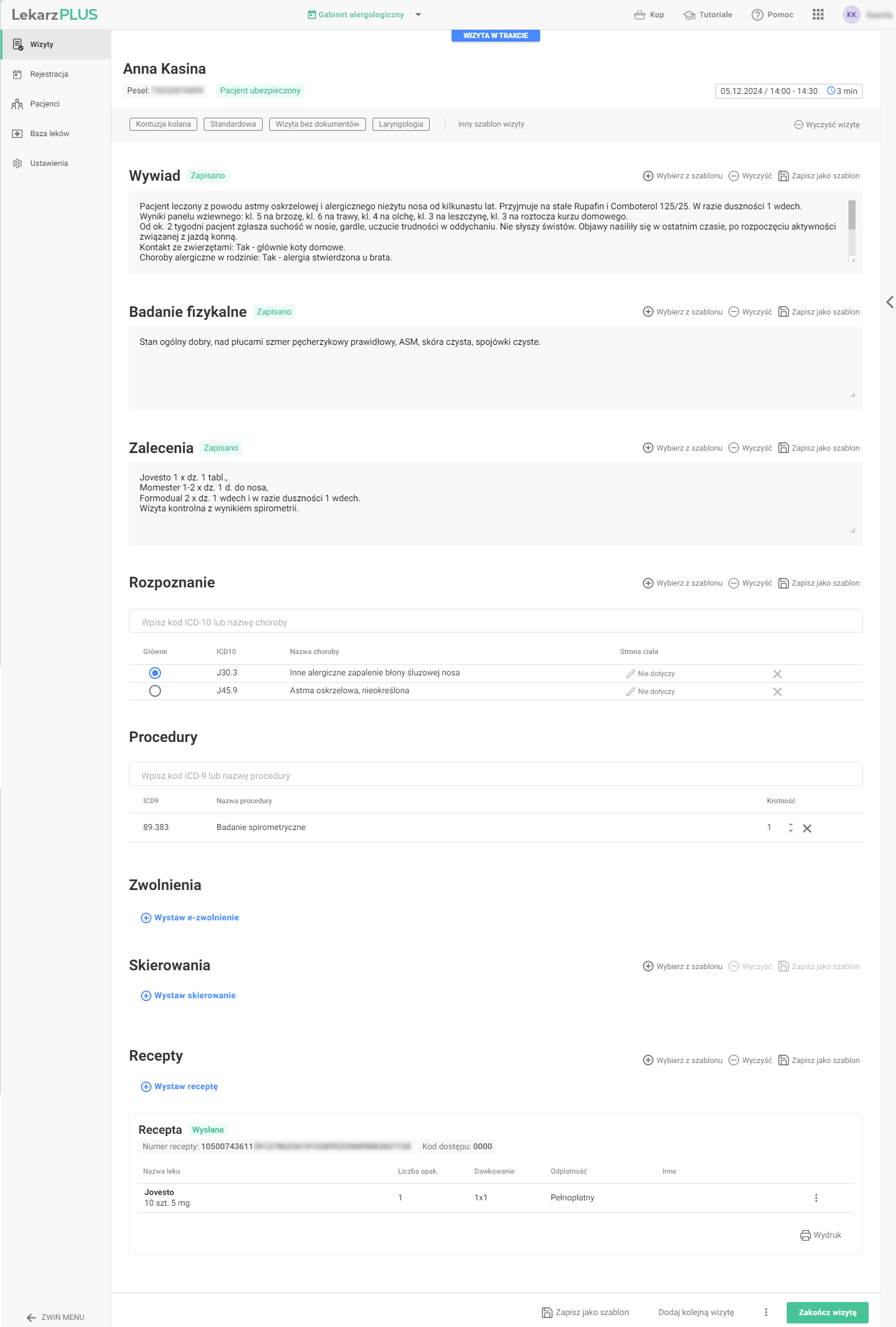 Specjaliści mogą sprawnie przygotować opis każdej wizyty, uwzględniając wszystkie jej etapy: od szczegółowego wywiadu, przez przeprowadzone badania fizykalne, po zalecenia i postawione rozpoznanie. Wygodnie obsłużą wystawianie e-Recept, e-Skierowań oraz e-Zwolnień, a gotowe szablony wizyt przyspieszają codzienną pracę. System automatycznie przesyła wymagane raporty do platformy P1 Ministerstwa Zdrowia, zapewniając pełną zgodność z obowiązującymi przepisami.